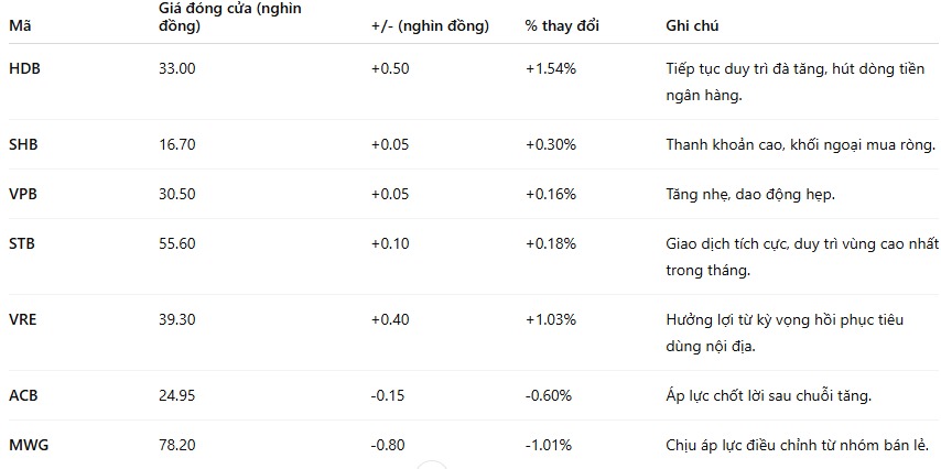 Dòng tiền ưu tiên một số mã ngân hàng (HDB, SHB, VPB, STB) , công nghệ như FPT trong khi nhóm bán lẻ, tiêu dùng tạm thời điều chỉnh kỹ thuật.