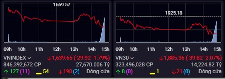 VN-Index giảm 29,92 điểm (-1,79%) xuống còn 1.639,65 điểm,