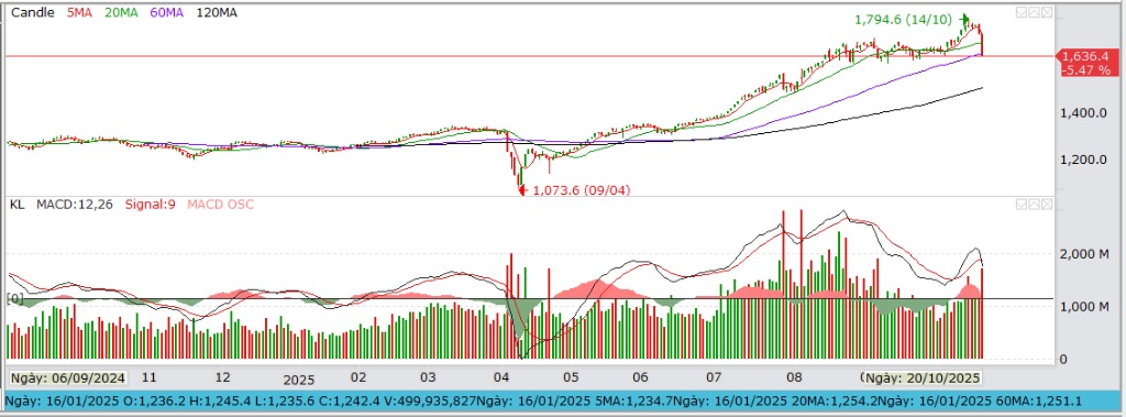 Phiên 20/10/2025 là một phiên giảm mạnh mang tính “hoảng loạn”, với mức giảm lớn nhất trong nhiều tuần gần đây.