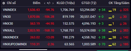 VN-Index đóng cửa ở mức 1.636,43 điểm, giảm 94,76 điểm (-5,47%).